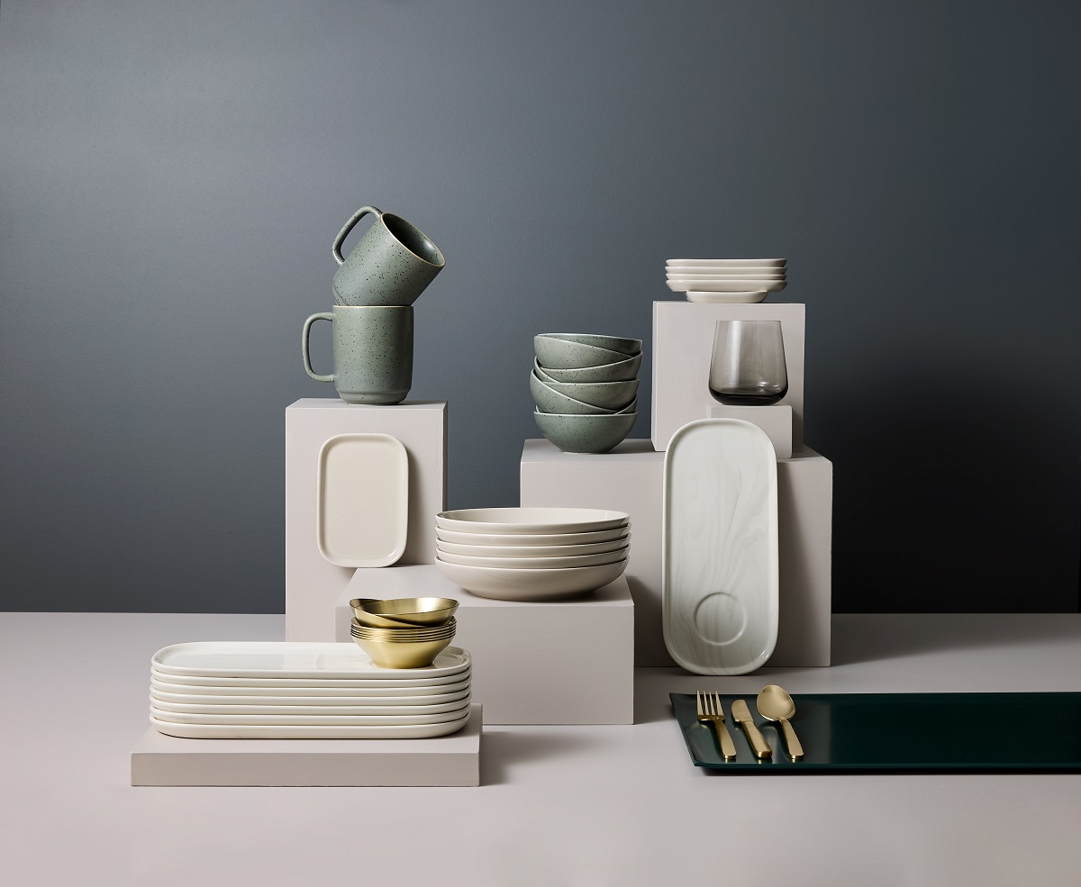 The bespoke collection features a refined entrée plate, elongated platter for chef-inspired presentations, textured stoneware bowl to hold hearty courses and a contemporary mug crafted for comfort in hand. Our new custom flatware set, featuring a brass-tone knife, fork and spoon with clean lines and a polished finish, adds modern sophistication to every meal. Complementing these are versatile side dishes, a brass-accent bowl for small bites and a sleek tray that ties the setting together.